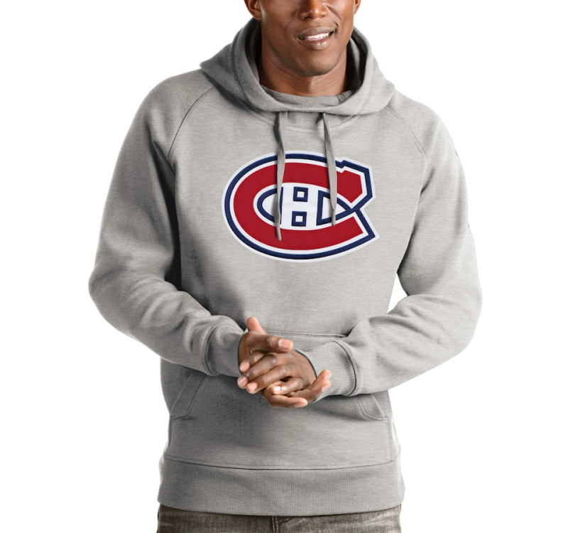 Showcase your Canadiens pride with the Montreal Canadiens Antigua Logo Victory Pullover Hoodie - Heathered Gray. Crafted with lightweight performance fabric for breathability and mobility, it features a rounded droptail hem and side vents for unrestricted movement. Advanced moisture-wicking technology keeps you dry during games or casual wear, blending fan spirit with athletic functionalit