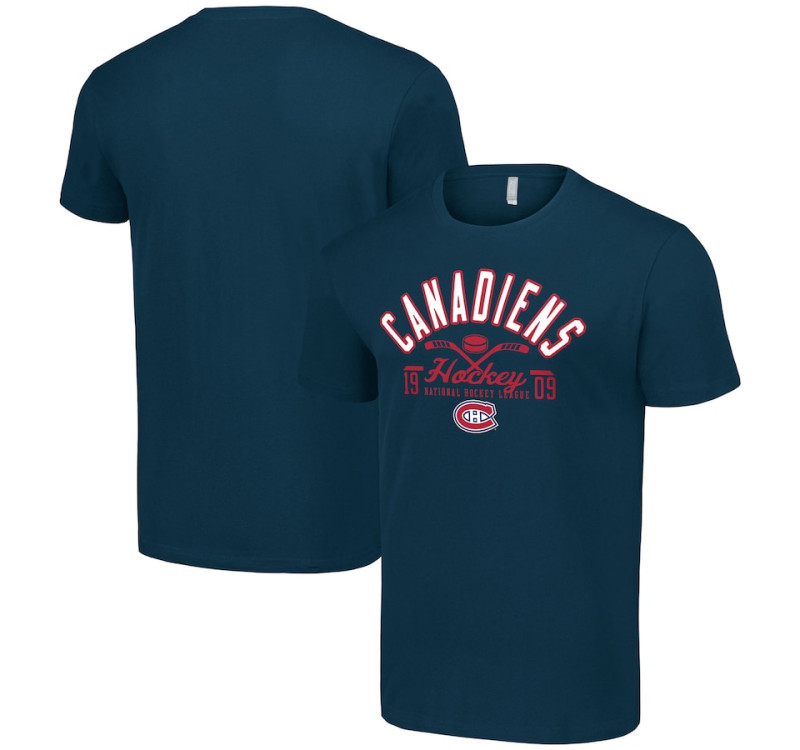 Showcase your Canadiens pride with the Montreal Canadiens Starter Half Puck Navy T-Shirt. Crafted with lightweight performance fabric for breathability and mobility, it features a rounded droptail hem and side vents for unrestricted movement. Advanced moisture-wicking technology keeps you dry during games or casual wear, blending fan spirit with athletic functionalit